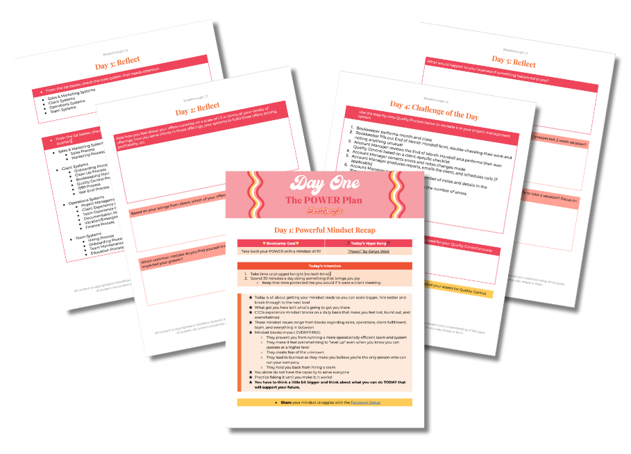 Each day, you'll receive a dedicated workbook tailored to the day's lesson. These workbooks guide you step-by-step in implementing mindset shifts, refining your offers for scalability and profitability, tackling business bottlenecks, planning team growth, setting up quality controls and KPIs, and paving the way to a work-optional business that runs without you.