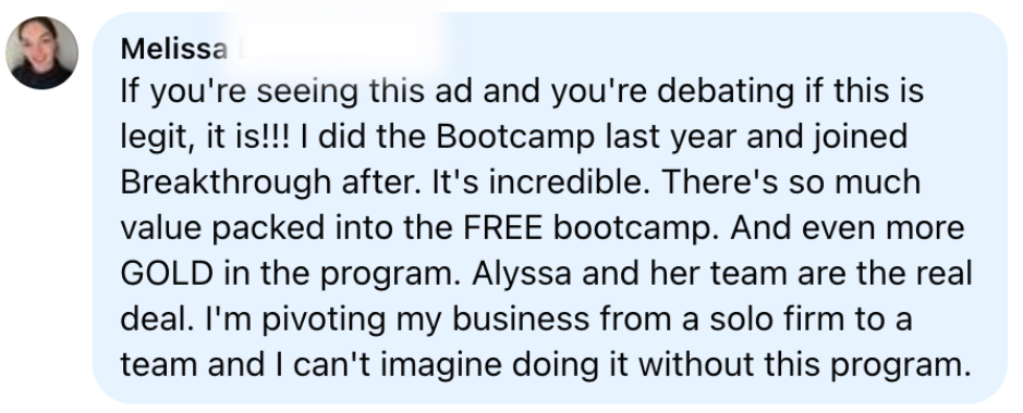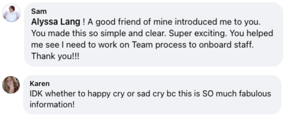 Join our exclusive Facebook Community during the bootcamp where you'll connect with fellow accountants and bookkeepers ready to nail down hiring, team, scaling and more. Get daily accountability check ins, live sessions, and direct support from Alyssa, our team, and expert coaches.