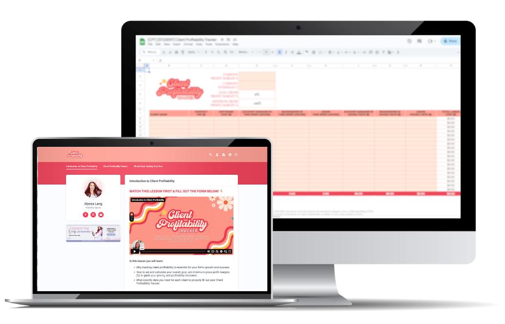 Lifetime access to a powerful, easy-to-use Client Profitability Tracker that will help you analyze profitability per client and make data-driven pricing decisions.